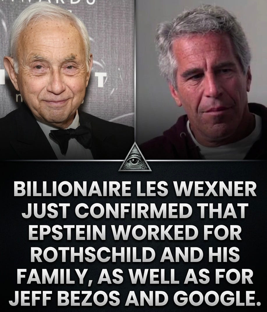 Mecenas Epsteina, Les Wexner, potwierdza, iż Epstein pracował dla Rothschildów. Zdeprawowani satanistyczni Żydzi i masoni posiadają nasze narodowe karty kredytowe, polityków i komentatorów. Rosyjska strona internetowa Yandex tajnie banuje mem "Reprezentuję Rothschildów", co jest dowodem na to, iż Rosja jest częścią tej farsy.